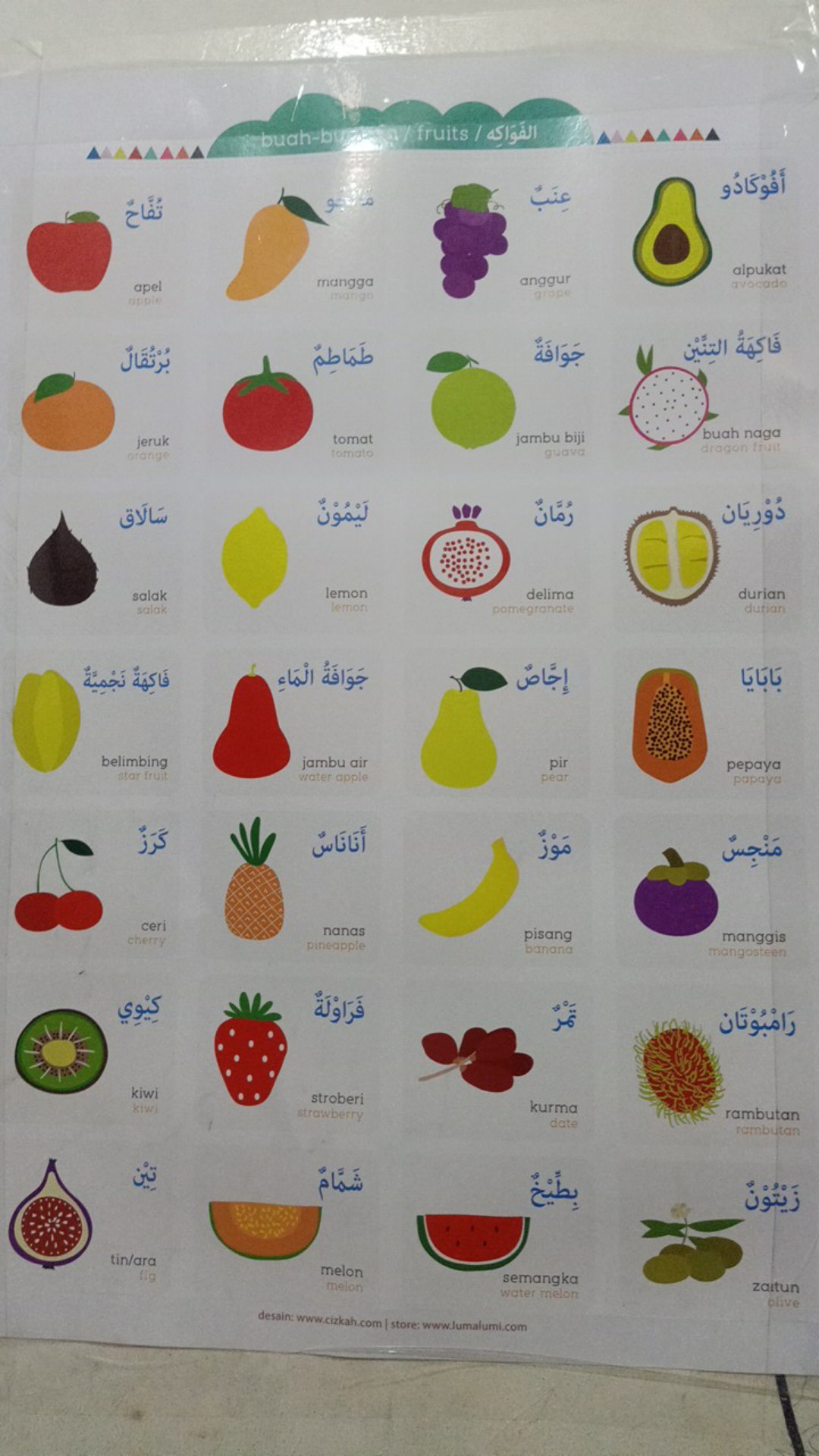 10000+ keputusan untuk 'buah buahan import bahasa arab' ; Portal ini diharapkan dapat membantu dalam mengumpul dan menyampaikan ilmu dalam . Bagaimana anda mengucapkannya dalam bahasa arab? Ceri, raspberi, blueberry, strawberi, lemon, limau purut, epal, oren, pir, pisang, . Bahasa arab tahun 3 : Bahasa arab tahun 3 :