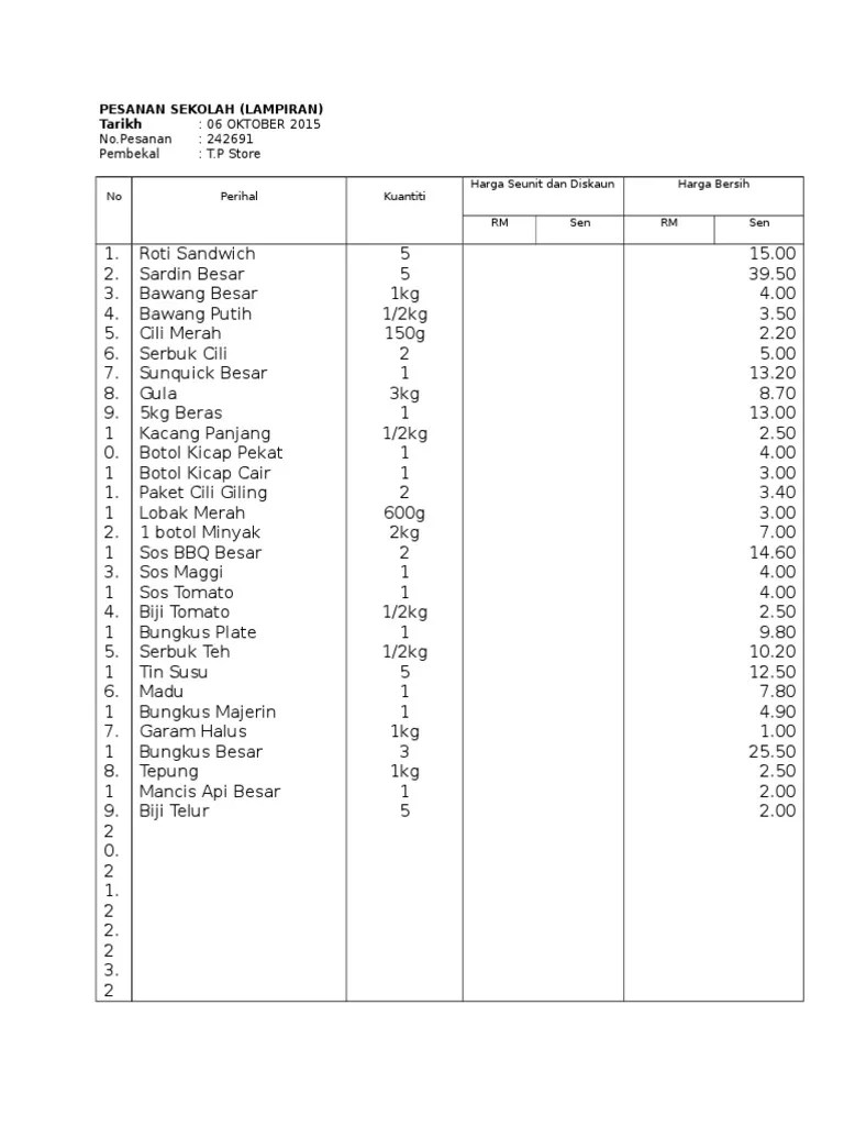 Bekalan makanan rancangan makanan tambahan sekolah tarikh pesanan dibuat : Lampiran 1 perjanjian rmt borang pesanan no. Muat turun borang pesanan faks dewan hadiah ulang tahun . 06 oktober 2015 no.pesanan : T.p store no perihal kuantiti harga seunit dan diskaun .